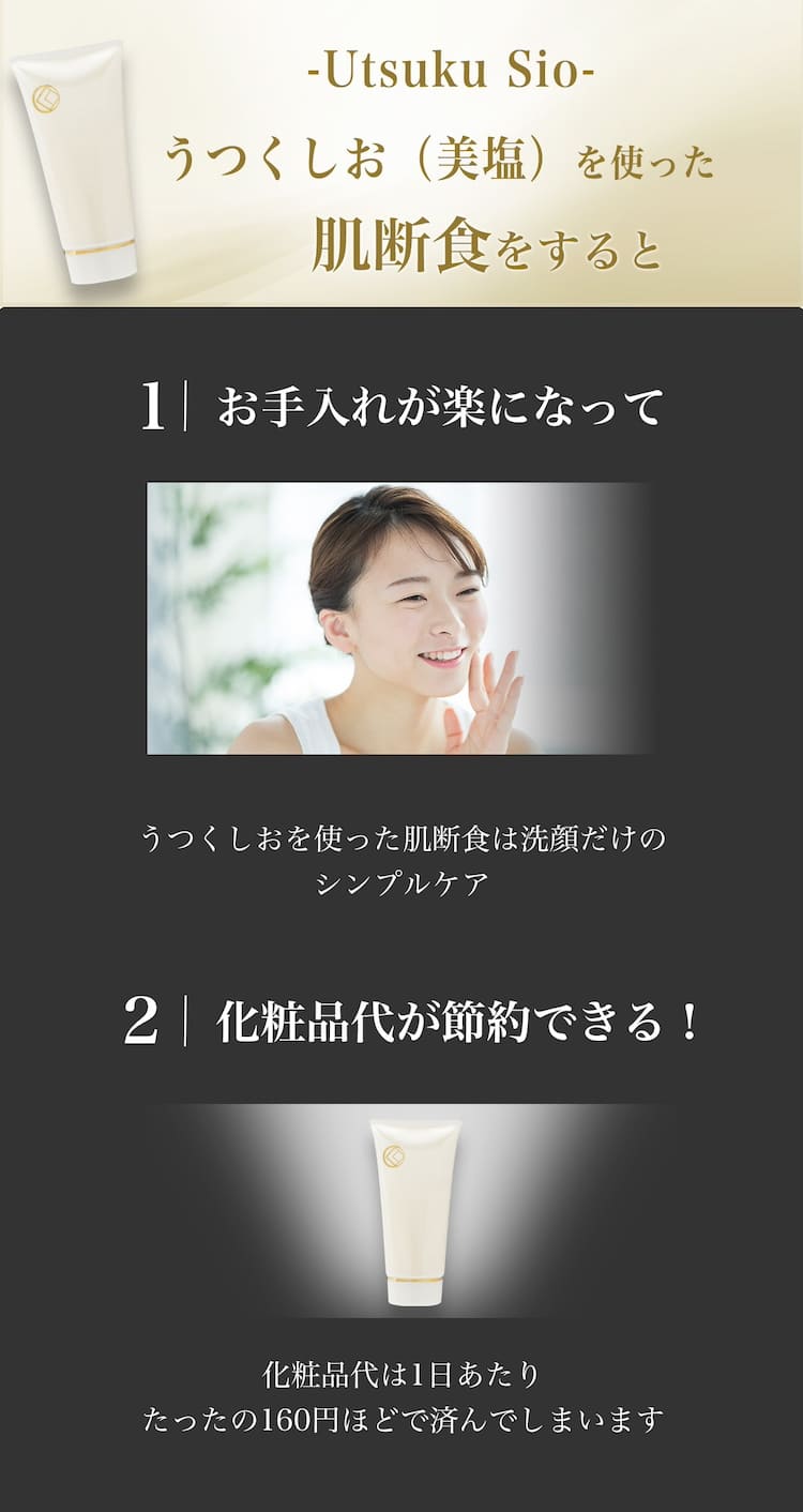 - うつくしお(美塩)は、ウマプラセンタなどの上質な美容成分がたっぷりと配合されているため、塩の刺激を和らげています。